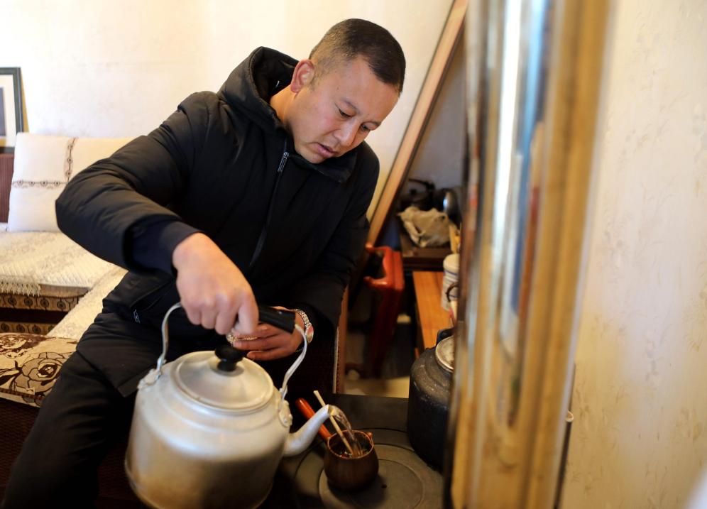 2月10日,元古堆村村民马海龙在家里煮罐罐茶。新华社记者 王朋 摄