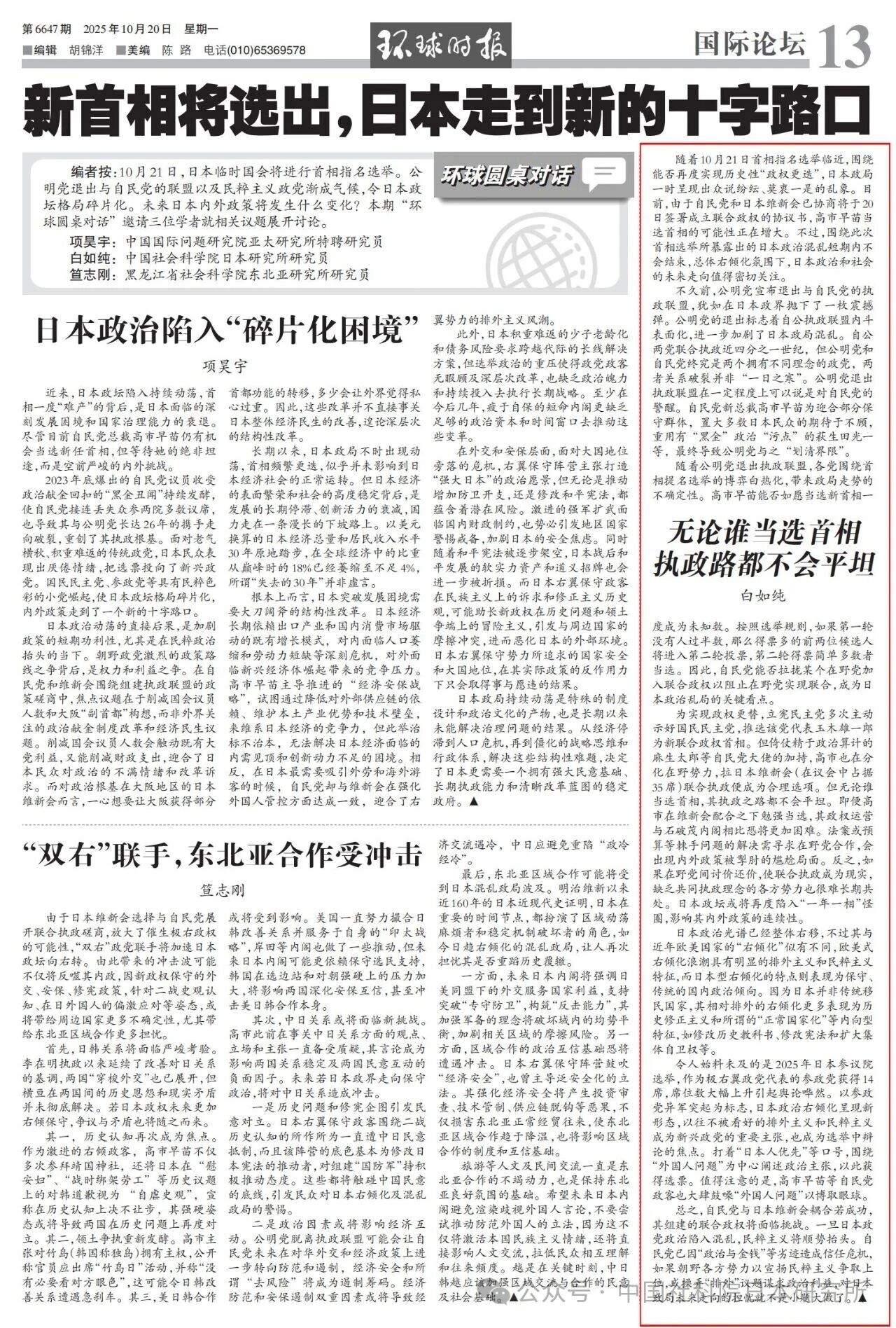 (来源:《环球时报》2025年10月20日13版;作者:白如纯,中国社会科学院日本研究所研究员。)